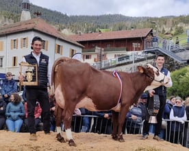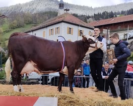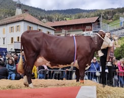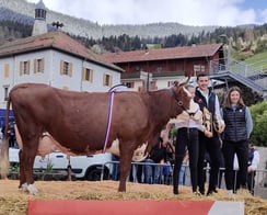 A l’image des concours du printemps, le cantonal de Thônes a connu une forte participation. 150 animaux étaient inscrits, ce qui représentait une difficulté notoire pour Manigod avec le peu de place disponible au centre du village. Grâce au dynamisme des agriculteurs de la commune, un ring a pu être aménagé et les 119 vaches finalement présentes (la pluie et le froid ont conduit à une trentaine de désistement) ont été jugées de 9h00 à 17h00 par Xavier et Corentin Croz. Les prix de championnat adulte et jeune sont revenus à des vaches du Gaec EFR l’Aulp de Montmin, déjà distinguées sur d’autres concours. Love (Cartouche x Santiago), championne adulte cumule cette année le prix de meilleure mamelle adulte à Paris et celui de championnat adulte obtenu au dernier départemental. Quant à la championne jeune Princesse (Millet x Iowa), elle avait été désignée grande championne au dernier National Vaches en Piste en 2023. Dans les catégories espoir, les deux prix spéciaux sont revenus à des filles de jeunes taureaux appartenant à des élevages de Manigod. Solyotte (Néonyme x Laclusaz) a été désignée championne espoir (Gaec la Ferme des 4 Seullis) et Séduite (Olastar x Denverse) au Gaec le Paret, meilleure mamelle espoir. Les premières filles d’Olastar (Loudix x Normand) séduisent par la qualité de leur mamelle. De bon augure, pour les 250 filles d’Olastar qui devraient vêler cet automne.