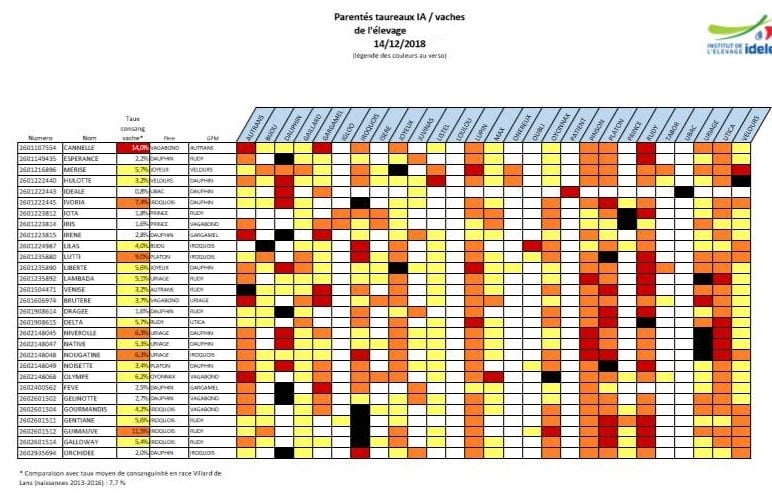 Autre service offert par l’IDELE : un tableau de parenté proposé à chaque élevage entre les vaches du troupeau et les taureaux d’IA ou de monte naturelle. Ce document permet de réduire la consanguinité et de préparer au mieux le conseil d’accouplement.